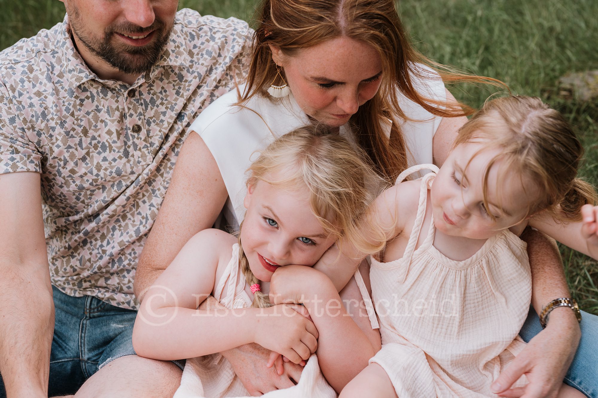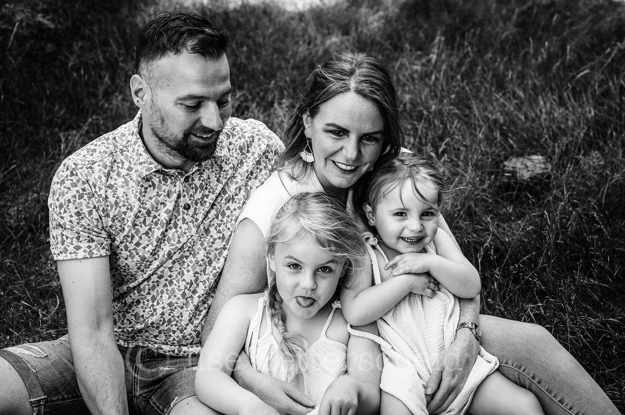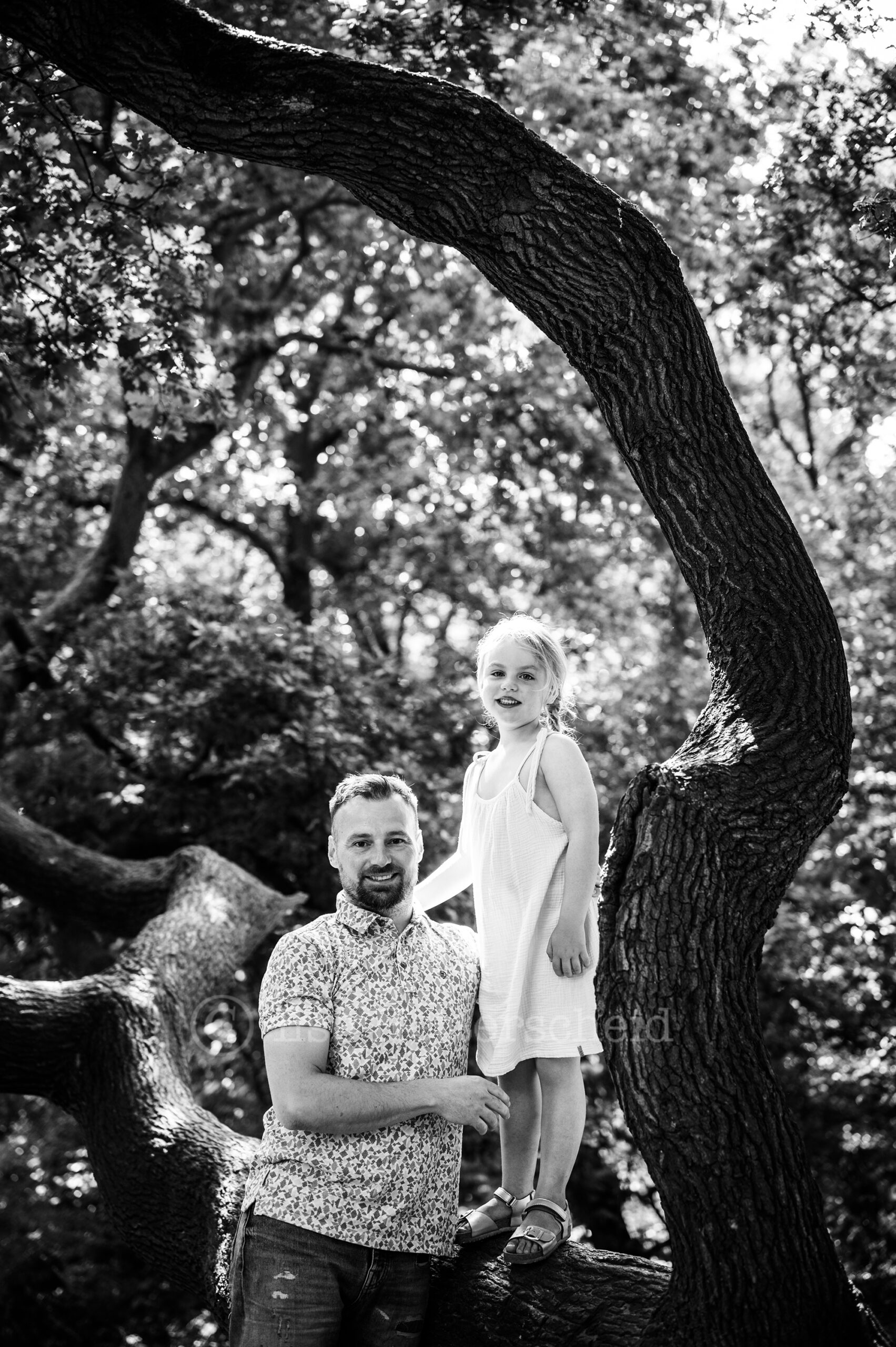 Een gezinsreportage met jonge kinderen is altijd ter plekke aanpassen en door het geven van kleine opdrachtjes probeer ik om de kinderen actief mee te laten doen om zo de echte momenten te vangen. Stil staan en poseren tja daar hebben kinderen nou eenmaal niet echt zin in ;). Ook deze dames wilde vooral en ondanks de warmte bezig blijven, lekker rennen en knuffels uitdelen, rondjes draaien en een stukje lopen of gewoon op de grond neerploffen en geen stap meer zetten. De kleine Didi werd bij het minste geringste afgeleid door andere dingen en eindigde dan bijvoorbeeld zittend in het zand met haar handen vol in het zand en vol dennenappels, resultaat zwarte handen (en gezicht haha) van het zand. Lotte wilde graag precies laten zien en vertellen wat ze nog niet zo lang geleden tijdens het zandbult festival allemaal had gedaan op deze plek, zo te horen had het indruk gemaakt een aanrader dus !. Als je met jonge kinderen keurige foto’s verwacht waarop iedereen in de lens kijkt en helemaal keurig schoon blijft dan moet ik je teleurstellen. Ik kan met de hand op mijn hart zeggen dat deze dametjes keurig schoon aankwamen dat dan weer wel ;). Vaak zijn de de beelden met een verhaal erachter die waar je jaren later het hardst om lacht (of tenminste begrijpend bij zucht). We lachen nu bijvoorbeeld nog het hardste om een foto die we tijdens de vorige reportage maakte van de meiden naast elkaar , Didi hard huilend en Lotte ontzettend boos kijkend. Er was zelfs een moment tijdens deze reportage dat papa opperde om de foto nu maar andersom te maken toen Lotte dit keer heel hard moest huilen omdat ze geprikt was op haar duim door een brandnetel.