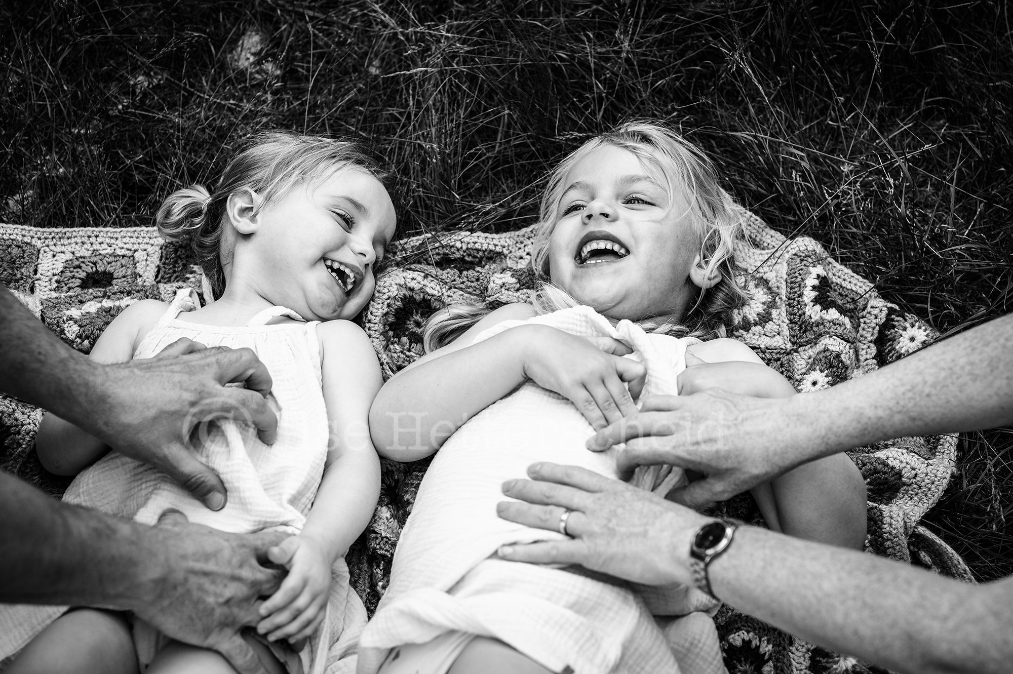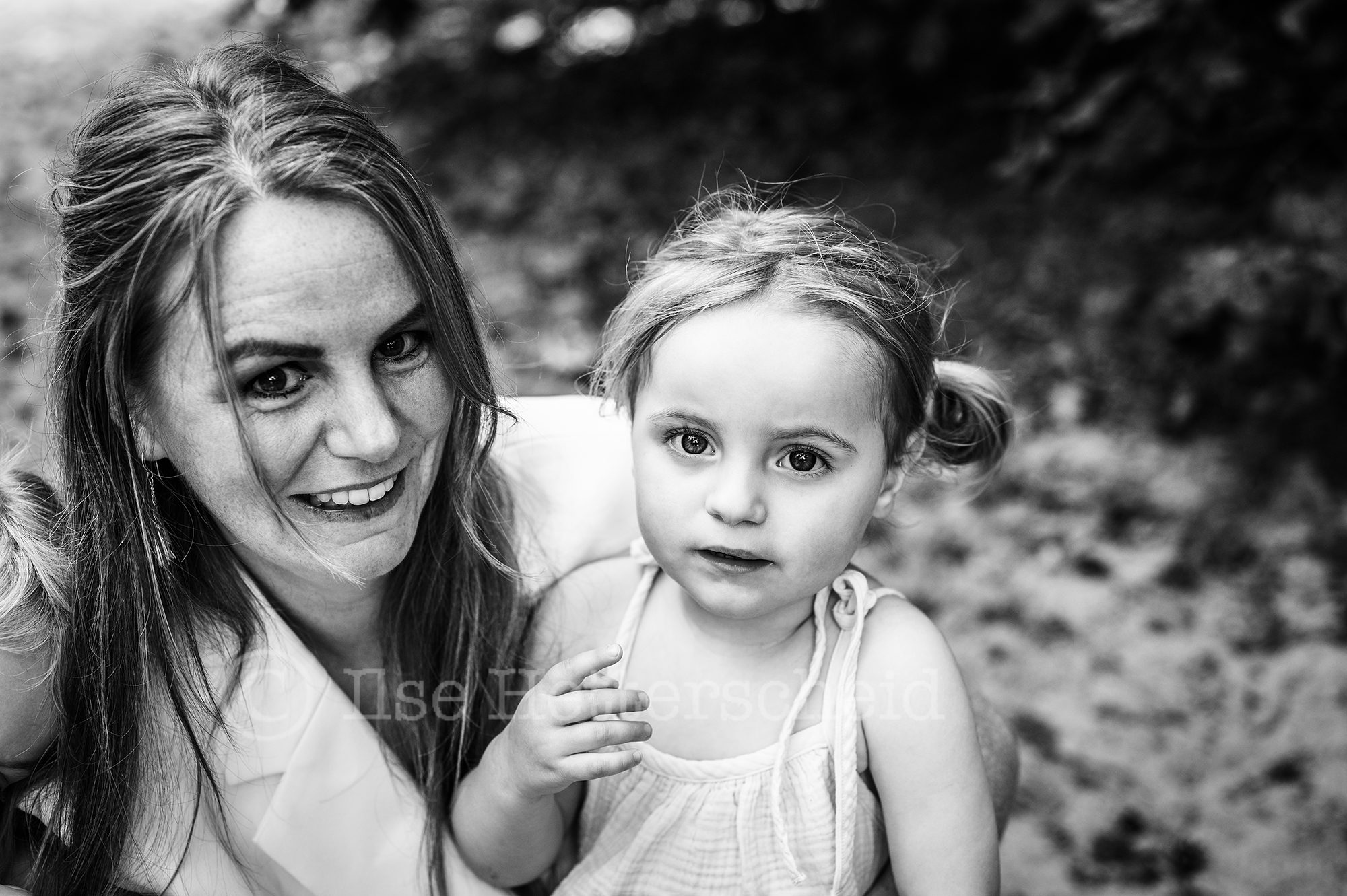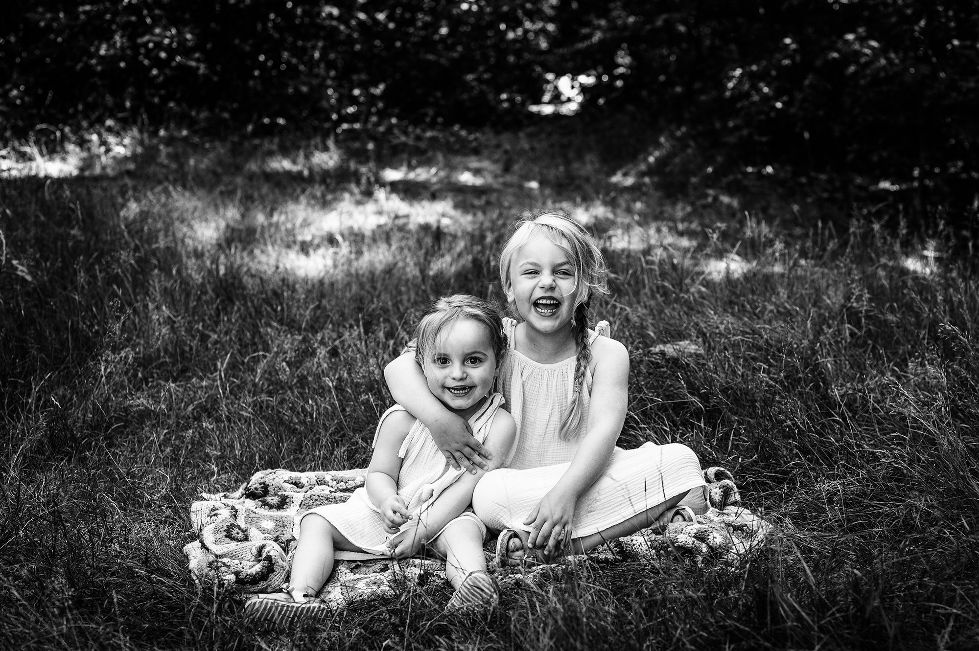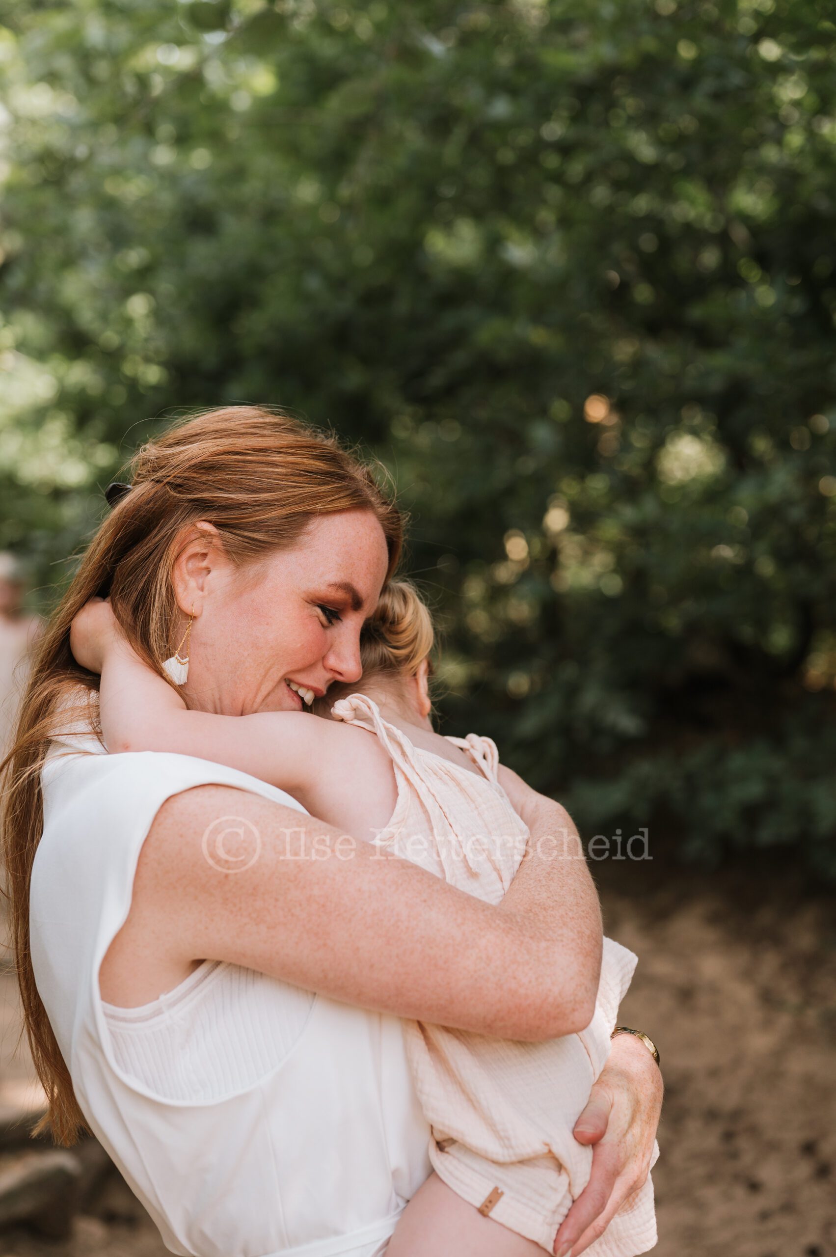 Een gezinsreportage met jonge kinderen is altijd ter plekke aanpassen en door het geven van kleine opdrachtjes probeer ik om de kinderen actief mee te laten doen om zo de echte momenten te vangen. Stil staan en poseren tja daar hebben kinderen nou eenmaal niet echt zin in ;). Ook deze dames wilde vooral en ondanks de warmte bezig blijven, lekker rennen en knuffels uitdelen, rondjes draaien en een stukje lopen of gewoon op de grond neerploffen en geen stap meer zetten. De kleine Didi werd bij het minste geringste afgeleid door andere dingen en eindigde dan bijvoorbeeld zittend in het zand met haar handen vol in het zand en vol dennenappels, resultaat zwarte handen (en gezicht haha) van het zand. Lotte wilde graag precies laten zien en vertellen wat ze nog niet zo lang geleden tijdens het zandbult festival allemaal had gedaan op deze plek, zo te horen had het indruk gemaakt een aanrader dus !. Als je met jonge kinderen keurige foto’s verwacht waarop iedereen in de lens kijkt en helemaal keurig schoon blijft dan moet ik je teleurstellen. Ik kan met de hand op mijn hart zeggen dat deze dametjes keurig schoon aankwamen dat dan weer wel ;). Vaak zijn de de beelden met een verhaal erachter die waar je jaren later het hardst om lacht (of tenminste begrijpend bij zucht). We lachen nu bijvoorbeeld nog het hardste om een foto die we tijdens de vorige reportage maakte van de meiden naast elkaar , Didi hard huilend en Lotte ontzettend boos kijkend. Er was zelfs een moment tijdens deze reportage dat papa opperde om de foto nu maar andersom te maken toen Lotte dit keer heel hard moest huilen omdat ze geprikt was op haar duim door een brandnetel.